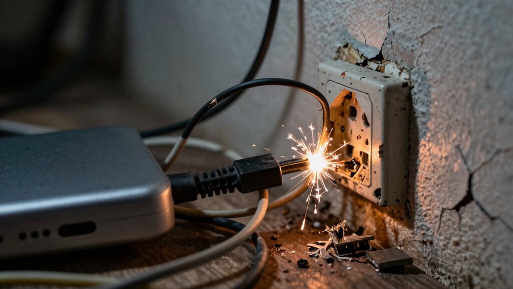 Yes, low-cost adapters can pose serious safety risks. Imagine sparks flying or a sudden surge that ignites a fire—electrical hazards lurking in cheap components. These adapters often lack proper insulation, quality control, or safety features, increasing your risk of electric shock or fire. You might not see the danger until it’s too late, so investing in quality adapters isn’t just smart—it’s essential for your safety.