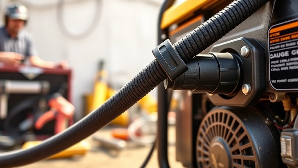 Using an undersized extension cord risks overheating, melting wiring, and causing fires—imagine your home turning into a fireworks display! It’s a clear violation of extension cord safety and wiring standards. You might save a few bucks now, but you’re risking damage to your generator, appliances, or even personal safety. Always choose the correct gauge to handle your load safely, respecting wiring standards and avoiding disaster.