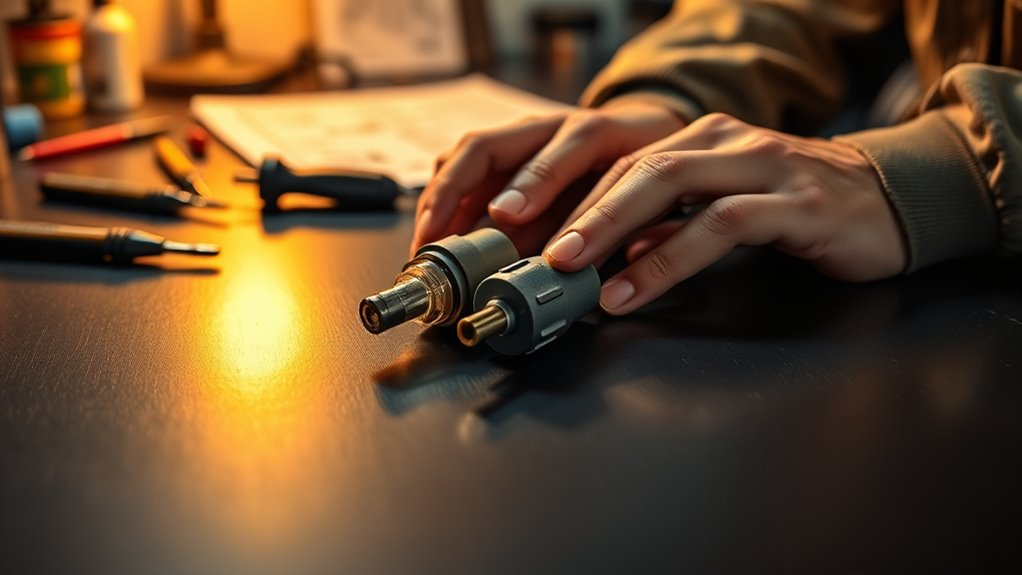 To determine if your spark plugs are functioning properly, a thorough visual inspection is essential. Start by examining the plug’s color coding; a healthy plug typically shows a light tan or grayish hue, indicating proper combustion. Look for signs of carbon buildup, oil deposits, or excessive wear, which can signal issues. Use tactile examination to check for cracks or damage on the ceramic insulator and electrode. Be attentive to the electrode’s shape—any rounded or eroded edges could suggest the need for replacement. Also, inspect the metal shell for corrosion or corrosion spots. Keep an eye out for signs of overheating, such as melting or blistering. Proper visual inspection helps spot early issues and guarantees your plugs are in peak condition. Additionally, performance upgrades like ECU tuning and cold air intakes can influence plug condition by affecting combustion efficiency.