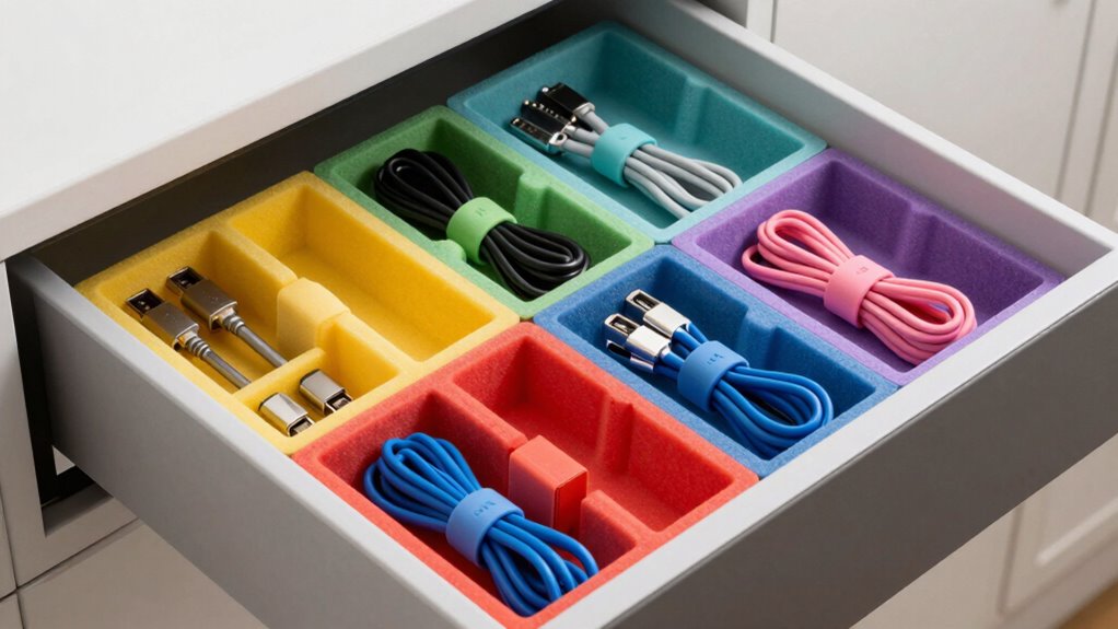 By giving your adapters a dedicated home, you turn chaos into harmony, making each connection easy to find like a familiar path through a well-tended garden. When everything has its place, you’ll glide through your day without the pesky weeds of misplaced chargers. Think of your organized space as a cozy, inviting nook—where every adapter is ready to lend a hand, quietly waiting to slip into action whenever you need it.