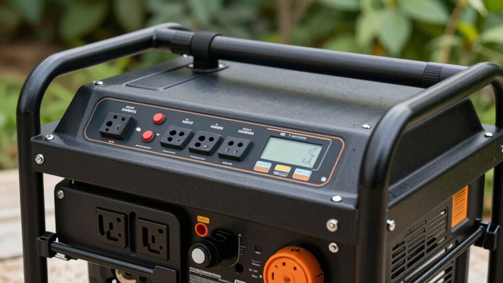 You should look for safety features like automatic shutoff, circuit breakers, and ground fault interrupters to protect your generator and home. Also, consider fuel efficiency to save on running costs and portability features such as wheels and handles, making it easier to move. These features guarantee safe operation, enhance convenience, and help you get the most out of your 9500-watt generator during power needs or emergencies.