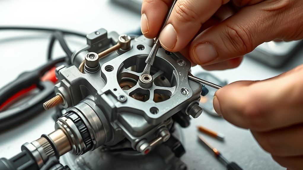 Think of your engine as a singer struggling to hit the high notes; a clogged carburetor mutes its song. You’ll notice trouble starting, rough idling, or inconsistent engine performance. Check the fuel mixture and idle adjustment—if they’re off, it’s a sign of a clog. Gunky buildup blocks airflow and fuel flow, causing these issues. Cleaning the carburetor restores harmony, ensuring smooth starts and a balanced fuel mixture.