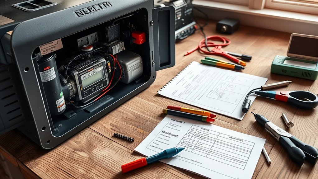 Keeping detailed maintenance records for your inverter generator helps guarantee it stays in top condition and lasts longer. By tracking maintenance records, you create a clear history of repairs, part replacements, and routine checks, which is essential for effective longevity planning. You’ll know when to perform tasks like oil changes, filter replacements, and inspections, preventing unexpected breakdowns. Maintaining these records allows you to identify patterns that might signal upcoming issues, giving you a proactive approach. Consistent documentation also helps if you need warranty service or resale, proving proper maintenance. Staying organized with your records ensures you follow your maintenance schedule precisely, maximizing your generator’s lifespan and reliability. In the long run, good tracking saves you time, money, and hassle, keeping your inverter generator running smoothly for years.
