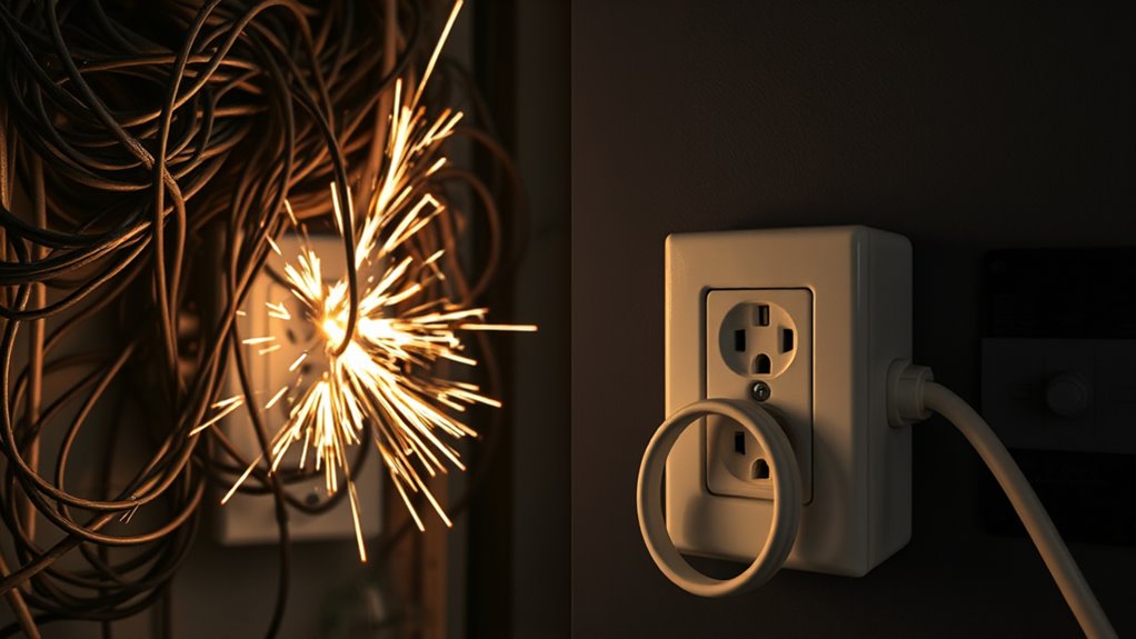 Understanding your electrical system is essential for electrical safety. Keep an eye out for signs of trouble, such as frequent circuit breaker trips, scorched outlets, or flickering lights. These signals indicate that your wiring may be overloaded or deteriorating, and addressing them promptly can prevent a potential fire. Never ignore these warning signs; instead, consult a professional electrician who can assess your wiring and recommend necessary upgrades. Regular inspections are fundamental, especially in older homes where wiring may not meet current safety standards. Taking proactive measures to guarantee your electrical safety reduces the chances of overheating wires, sparks, or short circuits that could ignite a fire. Incorporating essential electrical safety knowledge like understanding circuit capacities can further prevent hazards.