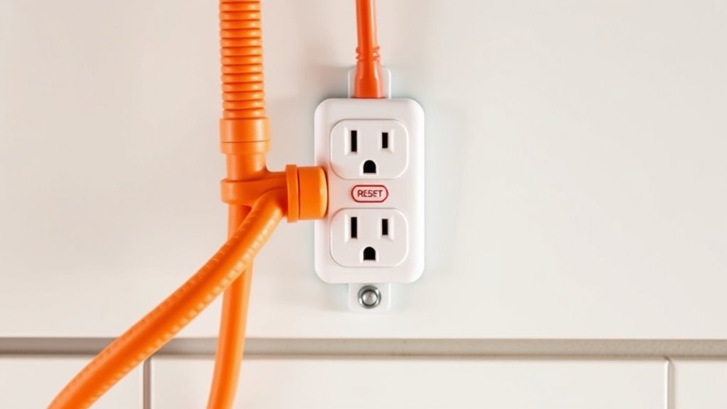 To make the most of GFCI outlets, you need to understand how they work and how to use them properly. Regular testing is a vital cord safety tip that you shouldn’t overlook. Most GFCIs have a test button; pressing it simulates a ground fault and checks whether the device trips correctly. If it doesn’t, you should replace the outlet immediately. Additionally, always guarantee the GFCI is properly installed and grounded according to the manufacturer’s instructions or by a qualified electrician. Proper installation guarantees that the device functions correctly and provides the intended protection. Never bypass or disable a GFCI; doing so defeats the safety purpose and exposes you to shock hazards. Understanding ground fault detection is essential for maintaining electrical safety in your home.