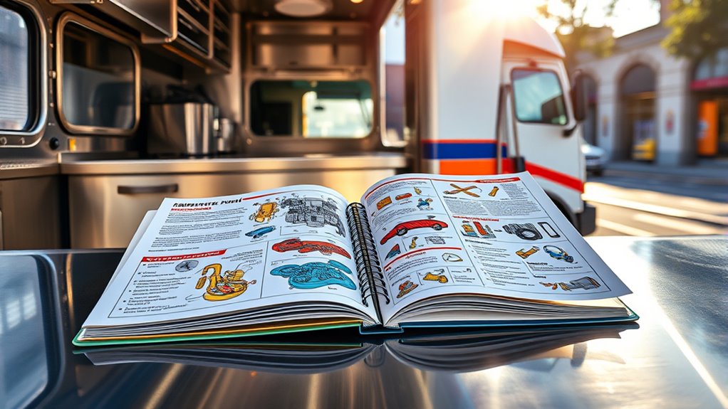 Regular inspections and preventive maintenance are essential for keeping your food truck running smoothly and avoiding costly breakdowns. By routinely checking your engine, electrical systems, and fuel lines, you ensure peak fuel efficiency and prevent unexpected failures. Pay close attention to weather preparedness; extreme temperatures or humidity can impact your vehicle’s performance. Regularly inspecting tires, seals, and vents helps protect against weather-related damage and keeps your truck operating reliably. Staying proactive with maintenance also means catching issues early, reducing repair costs and downtime. Keep detailed logs of inspections and repairs to track patterns and plan future upkeep. Additionally, understanding the importance of vetted maintenance practices can significantly improve your truck’s longevity and performance. Ultimately, consistent routines improve your truck’s dependability, save money, and ensure you’re always ready to serve your customers without interruption.