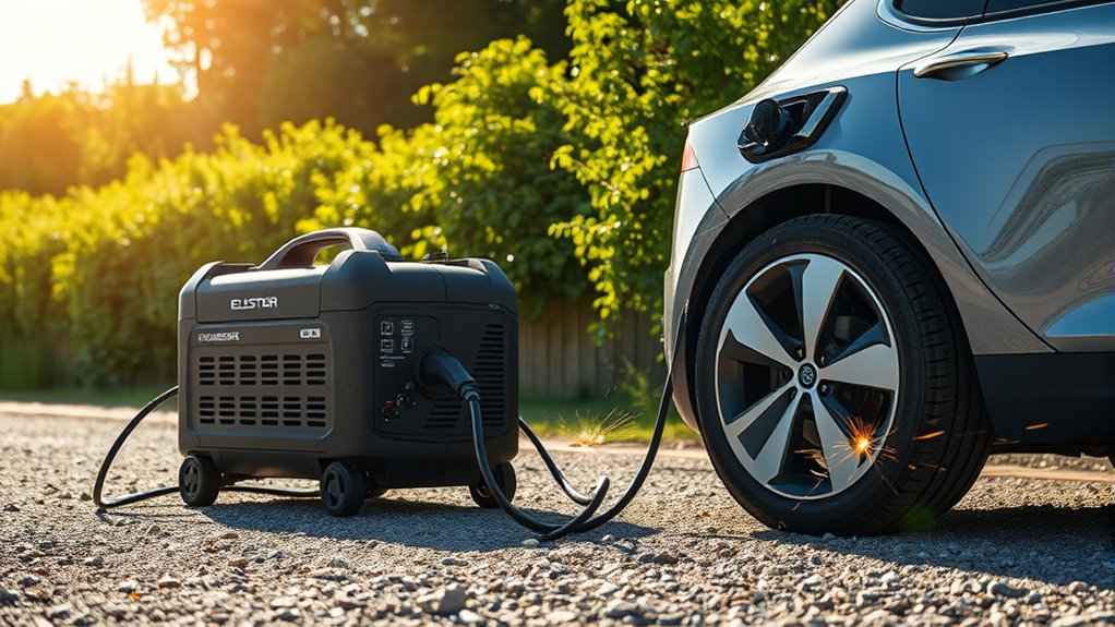 Not all electric car chargers can be powered by a generator. You need to check the charger’s power requirements and confirm your portable power source or generator is compatible. Some fast chargers demand high wattage, which many generators can’t reliably supply. It’s crucial to verify generator compatibility and make sure it can handle the charger’s power needs, especially for Level 2 chargers that require more energy.