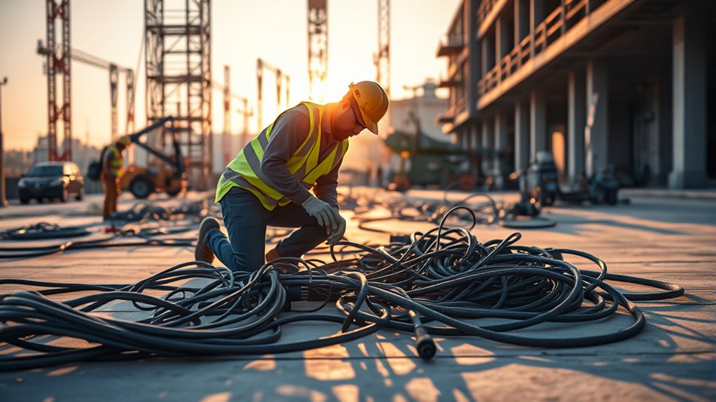 Think of steering jobsite power codes like sailing through a storm—you need a sturdy ship and a clear map. One project I know faced unexpected costs when overlooked permit delays, turning a smooth sail into rough waters. By staying proactive with compliance and planning ahead, you can steer clear of hidden expenses and keep your project on course. Don’t let unseen costs sink your budget—prepare now to avoid costly surprises later.