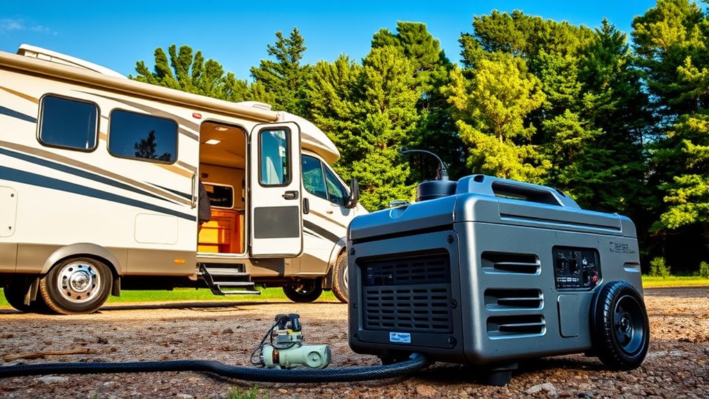 Ever wondered how much power your RV truly needs to keep everything running smoothly? Understanding your power requirements is the first step in choosing the right generator. It’s not just about the size of the generator but also about how you plan to supplement your power sources. For instance, solar panels are a popular addition for RV owners seeking sustainable energy. When considering solar panels, you need to think about how much energy they can generate and how that impacts your overall power needs. Solar panels reduce reliance on generators, but they don’t eliminate the need for one, especially if you want to run high-demand appliances or multiple devices simultaneously. To make the most of solar power, you’ll want to carefully consider inverter sizing. The inverter converts DC power from your solar panels or batteries into AC power used by your appliances. If your inverter isn’t properly sized, it might not handle your peak power demands, leading to system inefficiencies or even damage. A larger inverter can handle higher loads, but it also consumes more power when idle, so balance is key. To figure out the right inverter size, list out all the appliances and devices you plan to use at the same time, then add up their wattage. This total gives you a baseline for your inverter capacity. Keep in mind, surge wattage— the temporary spike when appliances start up—is also important and should be factored in. Once you know your inverter size, you can determine your overall power needs, which influences the generator size you’ll need. A generator must be capable of handling your maximum load comfortably, with some extra capacity for startup surges. If your appliances draw a combined 3,000 watts, aim for a generator rated slightly above that, say 3,500 to 4,000 watts, to ensure reliable operation. Don’t forget to factor in future upgrades or additional devices. While smaller generators are cheaper and more portable, they might not provide enough power for your entire setup, leading to inconvenience or reliance on extension cords and other makeshift solutions. Larger generators offer more flexibility but are heavier, louder, and more expensive. Striking a balance between size, power, and portability is essential. Ultimately, understanding your power needs—including your solar panel output and inverter sizing—helps you select a generator that offers reliable, efficient performance without excess fuel consumption or noise. Additionally, home energy management can help optimize your power usage, making your RV setup even more efficient and stress-free for your adventures.