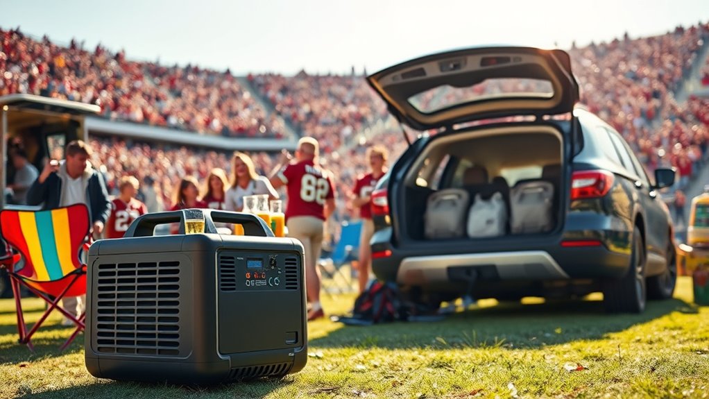Maintaining consistent power output is crucial for ensuring your appliances and devices run smoothly during tailgating. A stable supply prevents unexpected shutdowns and fluctuations that could damage sensitive electronics. Inverter generators excel here by providing low total harmonic distortion (THD), typically between 0.2% and 3%, which is essential for delicate equipment. Keeping the engine at a steady speed, especially in eco-mode, helps avoid voltage drops and surges. Proper load management and regular maintenance are also key to sustaining reliable power delivery over time. Additionally, a generator’s capacity to handle peak and running wattages accurately ensures it can adapt to changing loads without sacrificing stability. Overall, consistent power output keeps your tailgating setup dependable and safe.
