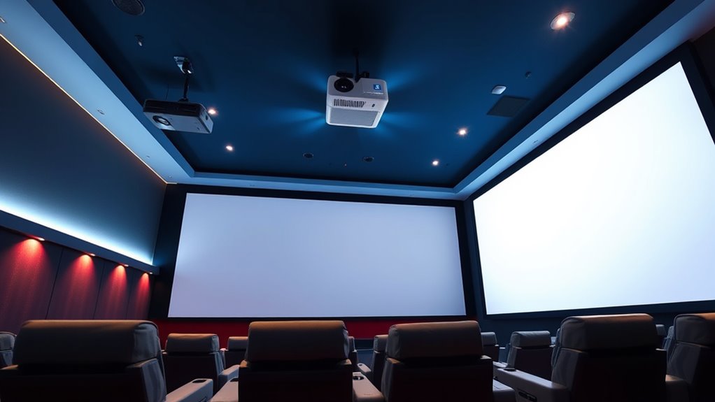 Setting up your 4K projector for top sound quality is easier than you think. First, position your speakers correctly—ideally, surround sound for immersive audio. Next, connect your projector to a high-quality receiver or sound system, ensuring all cables are secure. Adjust the audio settings to optimize bass, treble, and balance. Trust me, with a little tweaking, your sound will blow you away, making your home theater feel like a concert hall.