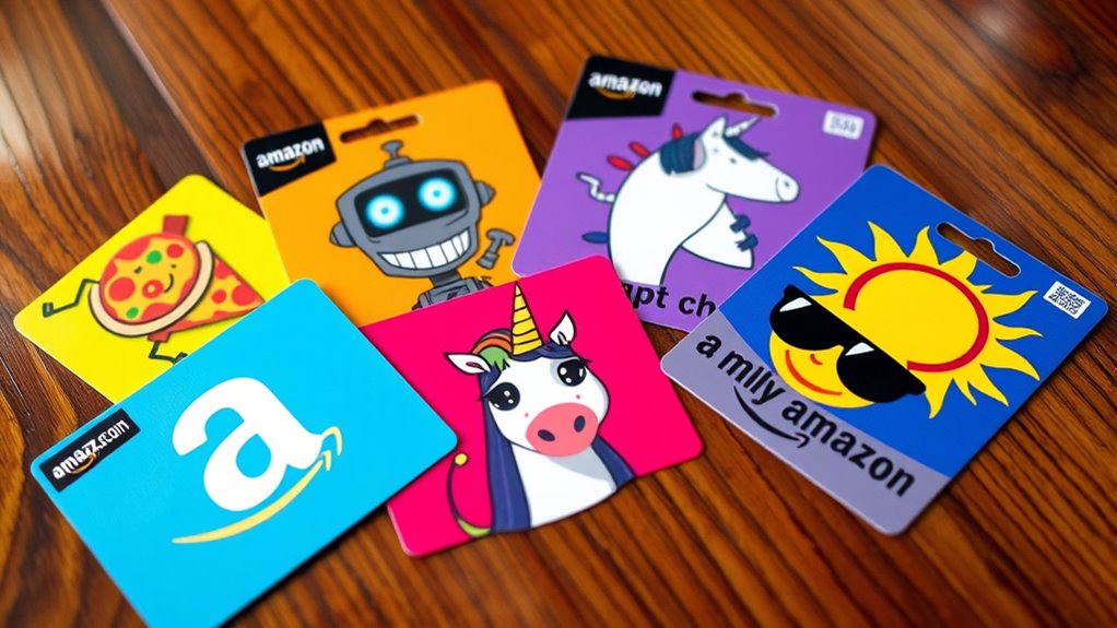 When considering funny Amazon e-gift card designs, personalization options can considerably enhance the gift’s impact. Adding custom messages, photos, or humorous captions allows you to tailor the card to the recipient’s personality, making it more memorable. Many designs let recipients choose their favorite funny theme or joke during redemption, adding an interactive element. Customization features often include selecting fonts, colors, or layouts to emphasize the humor. Some platforms even let you upload personal images or memes, creating a truly unique and hilarious design. Keep in mind, the level of customization varies—some offer fully editable templates, while others provide pre-made humorous options. These personalization choices help make your gift stand out and show thoughtfulness behind the humor.