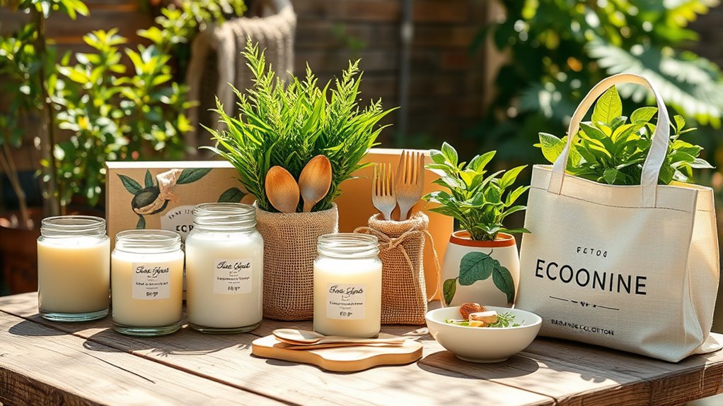 Looking for eco-friendly gifts that truly make a difference in 2025? I recommend focusing on items made from sustainable materials like bamboo, recycled paper, and biodegradable components. Think scented candles, personalized cutting boards, plantable seed calendars, and cozy hand warmers—practical yet stylish. These gifts support eco-conscious living while being meaningful and useful. If you’re curious about the top eco-gift ideas of 2025, there’s more to discover that can help you choose thoughtful, planet-friendly presents.