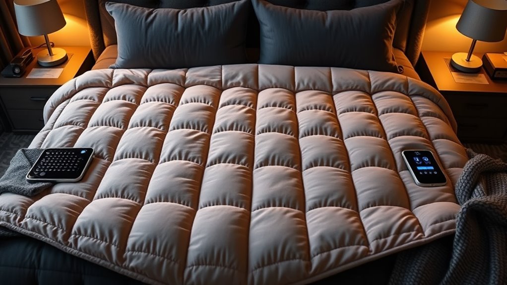 Dual control blankets are like a tailored suit—they let you set different heating levels for each side, making them perfect for couples with varied preferences. I love that I can keep my side warm without overheating my partner’s. Whether you like it toasty or just comfortably warm, these blankets adapt to your needs, ensuring cozy nights for everyone. They’re a versatile choice for personalized comfort.