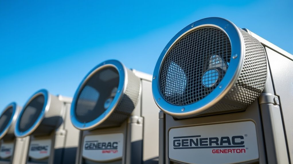 When maintaining your Generac generator, choosing the right air and fuel filters is essential for ideal performance and longevity. These filters keep dirt, debris, and contaminants out of your engine, ensuring smooth operation and preventing damage. Compatible with models like GP5500, GP6500, GP7500, and others, these filters are designed for easy installation and reliable performance. Using quality replacement filters and spark plugs from the appropriate kits helps maintain efficiency and extend your generator’s lifespan. Regularly replacing these components guarantees your generator runs reliably when you need it most, especially during power outages or emergency situations.