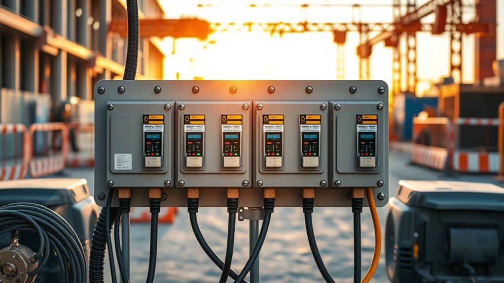 Choosing the right generator transfer switch for your jobsite depends heavily on the installation environment. Indoor switches are designed with less weatherproofing and usually lack heavy-duty enclosures, making them ideal only for protected, indoor settings. They’re smaller and not rated for exposure to moisture or extreme temperatures. Outdoor transfer switches, on the other hand, feature NEMA 3R or higher rated enclosures that resist rain, dust, and corrosion, ensuring reliable performance in harsh weather. Proper installation for outdoor switches involves considering grounding and weatherproof wiring to prevent hazards. Selecting between indoor and outdoor models hinges on your site’s environment; using the correct type guarantees safety, durability, and dependable operation regardless of weather conditions.
