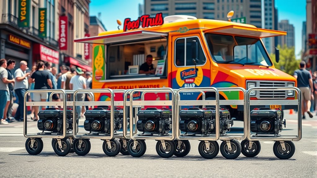 If you’re looking for the best generator wheel kits for your food truck in 2025, I recommend checking out options like heavy-duty wheel and handle sets for Champion, WEN, and stainless steel carts. These kits offer easy mobility, rugged tires, foldable handles, and compatibility with popular models. They’re designed for outdoor use and feature durable materials that hold up on rough terrains. Keep exploring to find the perfect fit for your mobile setup and power needs.