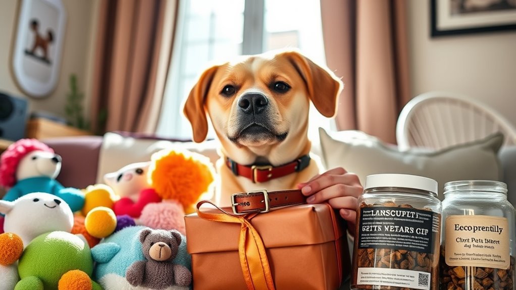 Choosing eco-friendly gifts for pet owners is like picking a needle out of a haystack, but it’s doable! I look for items made from sustainable materials, such as bamboo or recycled plastics, and brands with transparent eco-practices. Checking for certifications like Fair Trade or USDA Organic helps confirm authenticity. By prioritizing these factors, I can gift something thoughtful that also cares for our planet and furry friends.