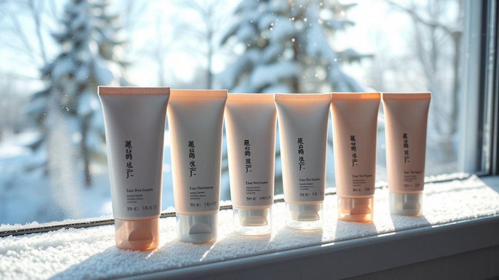 If you’re looking for Korean sunscreens that protect your skin and keep it glowing in winter, I recommend trying d’alba Waterfull Serum, Anua Zero-Cast, mixsoon Bean Sunscreen, SOME BY MI V10, and COSRX Vitamin E. These options offer broad-spectrum SPF, hydrating ingredients, and lightweight textures that suit sensitive or dry skin. They prevent white cast and provide a dewy finish, making your skin look healthy even in cold weather. Keep exploring for more tips on choosing the best winter sunscreens.