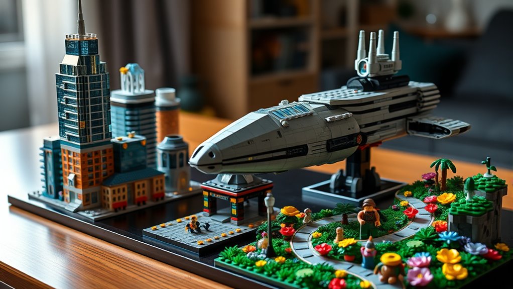 If you’re looking to add a touch of charm to your space, I recommend themed Lego sets like the detailed modular buildings or iconic landmarks. They double as eye-catching decor and conversation starters. I’ve found that these sets blend seamlessly into interior design, creating a playful yet sophisticated vibe. Building and displaying them gives your home a personalized, artistic flair—turning your collection into a mesmerizing focal point.