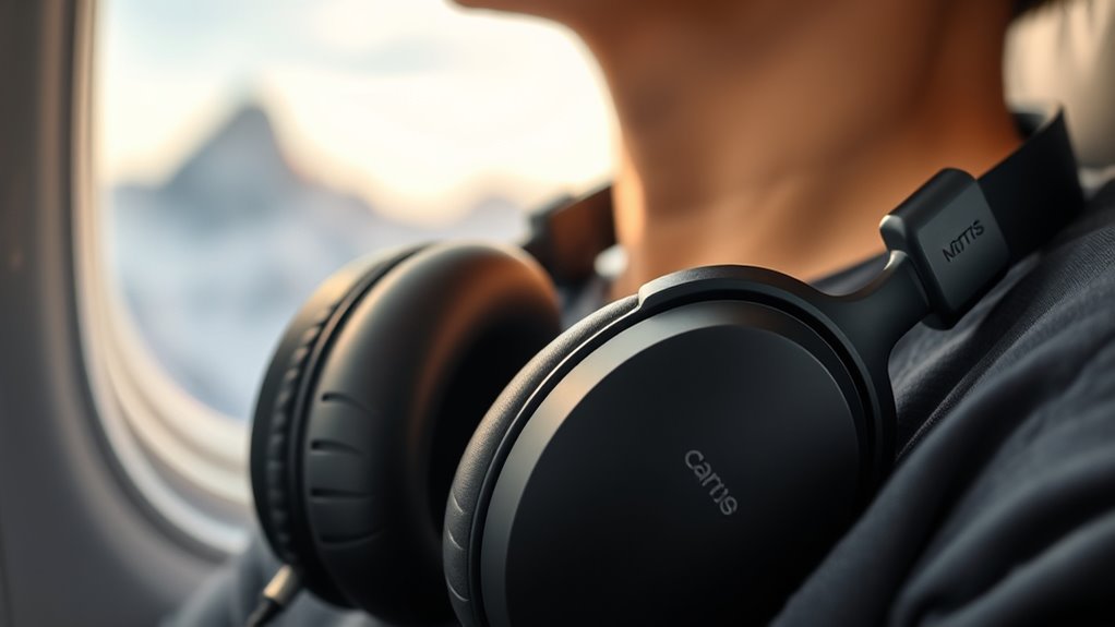 Comfort and fit play a crucial role in making sure your noise-canceling headphones feel good during extended travel sessions. Look for headphones with adjustable headbands and plush ear cups to guarantee a secure, comfortable fit for long hours. Memory foam ear cushions that mold to your ears help reduce pressure and prevent discomfort over time. Lightweight, ergonomic designs minimize strain on your head and neck, which is especially important during lengthy journeys. It’s vital that the headphones fit snugly without being too tight, so they stay in place without causing pressure points. Foldable or collapsible models are a great choice—they make packing easier and maintain consistent comfort across different environments. Prioritizing comfort and fit ensures you can enjoy your music without distraction or discomfort.