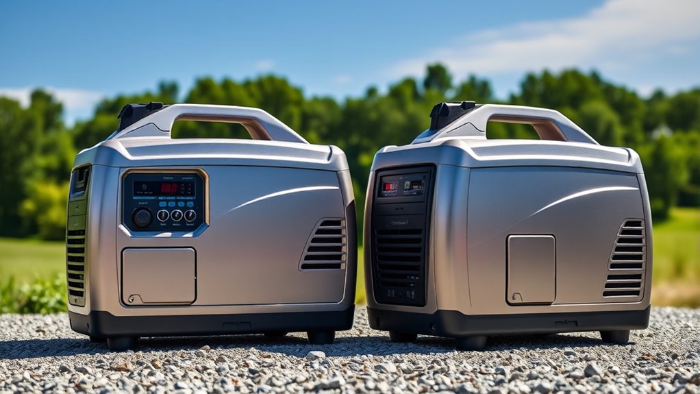 Since noise levels can be vital to your RVing experience, it’s important to pay attention to how loud a generator operates. Portable inverter generators typically produce between 52-57 dBA, similar to normal conversation, making them ideal for quiet camping environments. Lower noise levels help minimize disturbance to nature and fellow campers, ensuring a more enjoyable experience. Generators exceeding 60 dBA can become intrusive, affecting your comfort and communication. Keep in mind that noise levels can vary based on load, engine speed, and design features like mufflers and enclosures. When choosing a generator, look for models with specified low decibel ratings to guarantee quieter operation, especially during light loads. Considering noise levels at full load versus typical use helps you select a generator that’s both powerful and considerate.
