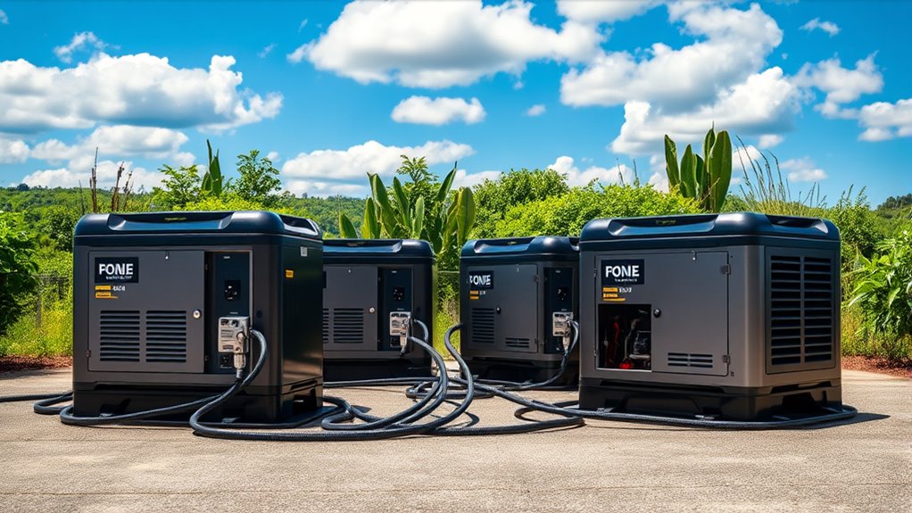 To guarantee compatibility between different generator brands, I always check if they support the same parallel kits and have matching output specifications. I look for generators with compatible wattage, voltage, and frequency ratings, and I verify that their control panels can communicate effectively. Reading manufacturer guidelines and consulting with experts helps me avoid issues. Staying informed about updates and using certified accessories ensures seamless operation when paralleling different brands.