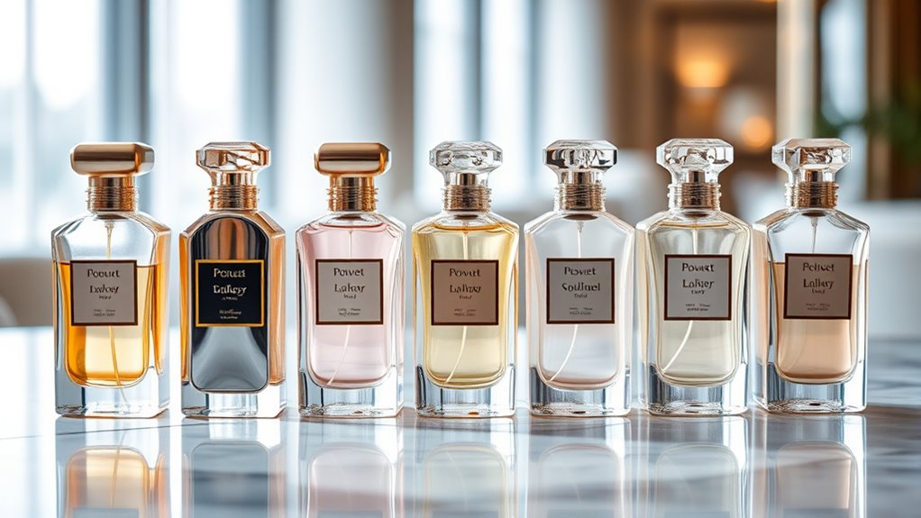 If you’re wondering which perfumes last longer on your skin, I recommend choosing fragrances with base notes like vanilla, musk, or amber. These notes tend to cling longer and develop beautifully over time. I always look for eau de parfum or parfum concentrations, as they contain more oils and last longer than eau de toilette. Testing scents on your skin helps make certain they stay with you all day, keeping you confident and fresh.