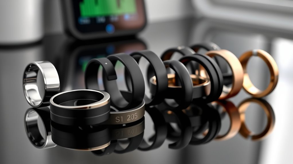 Ensuring a proper fit is essential because a smart ring that’s too loose or too tight can compromise both comfort and data accuracy. An ill-fitting ring can cause sensors to lose contact with your skin, leading to unreliable health readings. To get the right size, many brands recommend using a dedicated sizing kit or measuring your finger’s circumference carefully. Keep in mind that smart ring sizes often differ from standard US ring sizes, so it’s best to consult the brand-specific sizing guides or kits. A well-fitting ring should sit snugly without feeling constrictive, allowing sensors to stay in proper contact. This not only guarantees accurate data collection but also makes extended wear—during sleep, workouts, or daily activities—more comfortable and consistent.